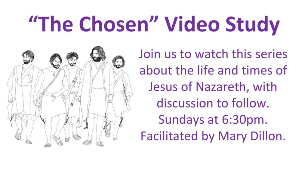 Join us for a video study group on Sunday evenings from 6:30-8:30pm in the library-chapel. Each week we will watch an episode of “The Chosen”, followed by reflection and discussion led by Mary Dillon.