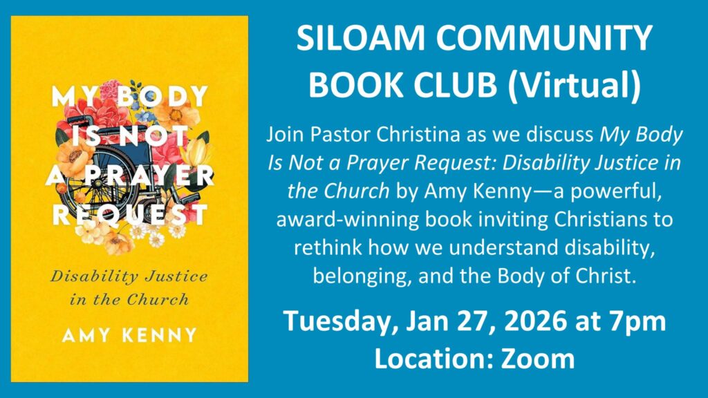 You’re invited! Join Pastor Christina on January 27, as we gather on Zoom to discuss My Body Is Not a Prayer Request: Disability Justice in the Church by Amy Kenny—a powerful, award-winning book inviting Christians to rethink how we understand disability, belonging, and the Body of Christ.